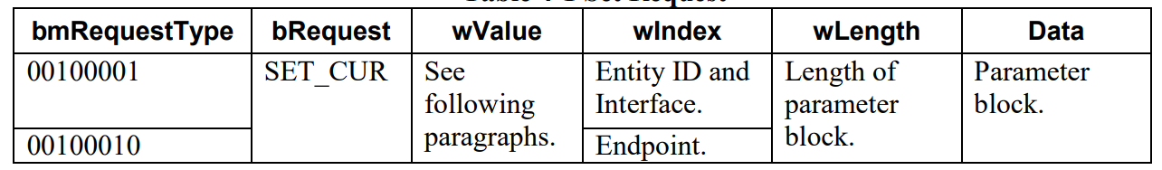 The bmRequestType field specifies that this is a SET request (D7=0). It is a class-specific request (D6..5=01), directed to either the VideoControl interface, or a VideoStreaming interface of the video function (D4..0=00001), or the video data endpoint of a VideoStreaming interface (D4..0=00010).