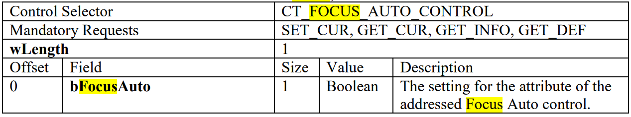 Relevant note: The Focus control can optionally provide support for an auto setting (with an on/off state). If the auto setting is supported and set to the on state, the device will provide automatic focus adjustment, and read request will reflect the automatically set value. Attempts to programmatically set the Focus control when in auto mode shall result in protocol STALL with an error code of bRequestErrorCode = “Wrong State”. When leaving Auto-Focus mode (into manual focus mode), the control shall remain at the value that was in effect just before the transition.