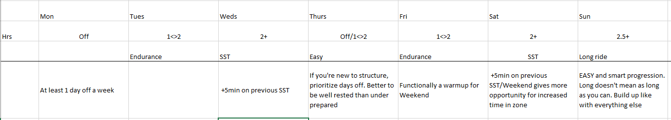So the main thing I’d say to you is that if you are getting the intensity correct, you will be able to do sweetspot for ~60min from the very beginning. So if you were to start with the progression plan you’ve given, you’re not actually going to be improving much beyond the noob gains for the 4.5wks that plan would take The progression my athletes get is 60min, 70, 80, etc (My note: and they do it until they can do 2-2.5 hours of it???!)